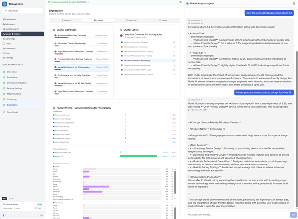 収集されたテキスト・チャンクや概念テーブルから、成長バッチ・ニューラルガス+最小全域木(GNG+MST)テクノロジーにより、概念構造モデルを構築します。主要な次元やクラスタの意味をAIが解釈してラベル付けします。選択したクラスタやノード領域の統計的特徴をプロファイル・チャートで分析することができます。ノード(概念)間の接続関係がエッジで表現されます。特定のノードを起点に新しい概念(コンセプト)をAIに推論させることができます。